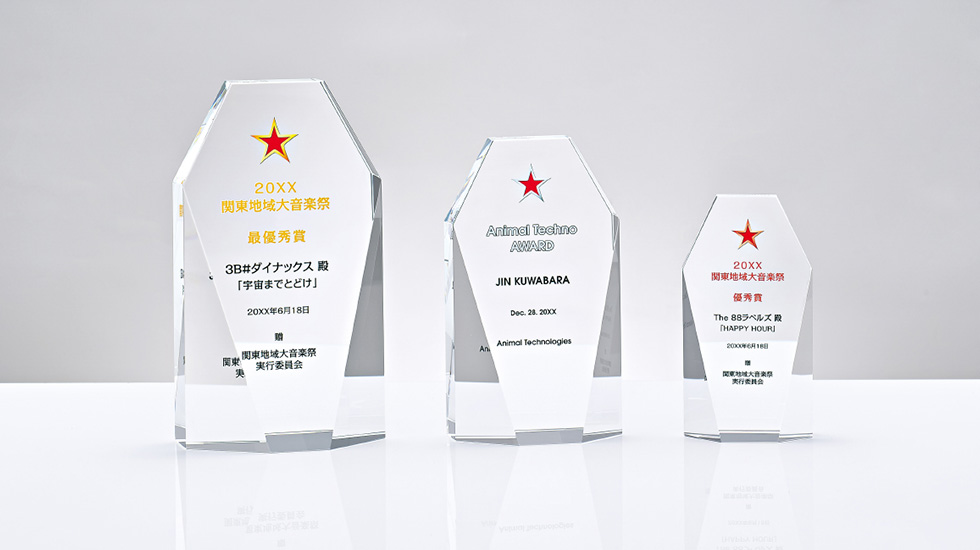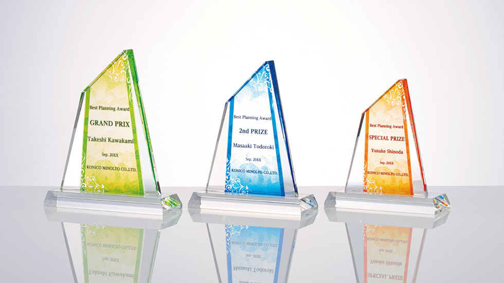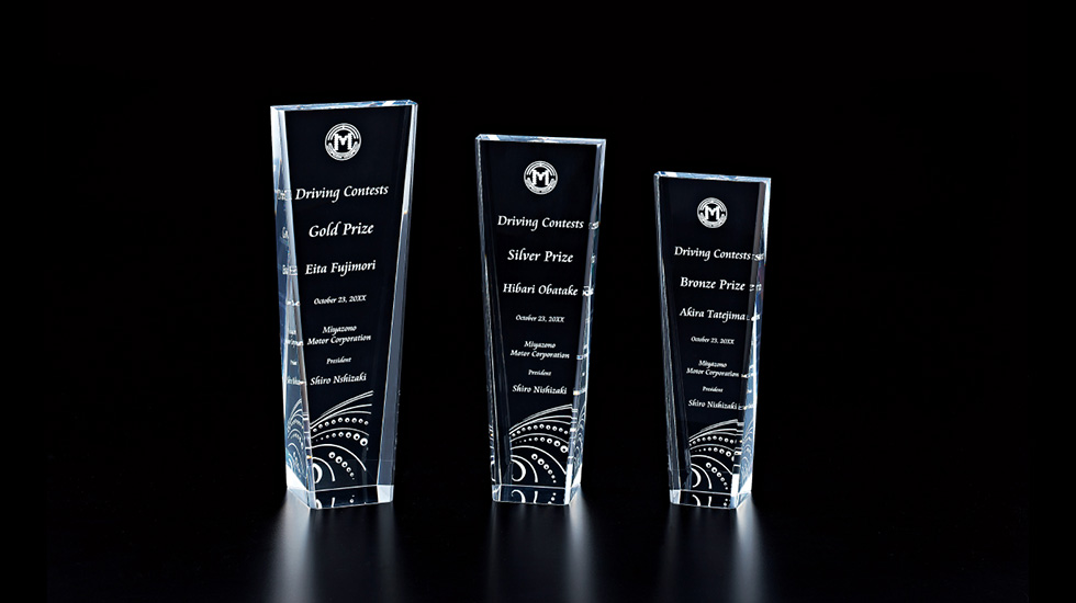 栄光を美しいフォルムでお届けするアワードスタイル。ご予算に応じてご提案から製作までサポートいたします。企業ロゴやメッセージも、カラー印刷やレーザー彫刻で表現することが出来ます。